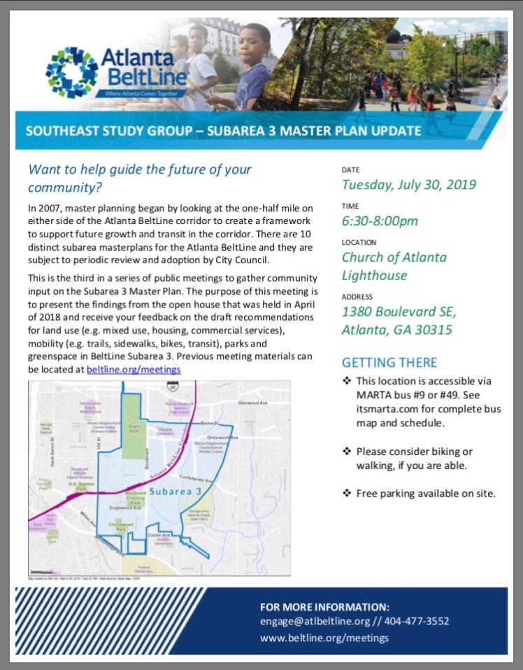 This is the third in a series of public meetings to gather community input on the Subarea 3 Master Plan. The purpose of this meeting is to present the findings from the open house that was held in April of 2018 and receive your feedback on the draft recommendations for land use (e.g. mixed use, housing, commercial services), mobility (e.g. trails, sidewalks, bikes, transit), parks and greenspace in BeltLine Subarea 3. Previous meeting materials can be located at here.