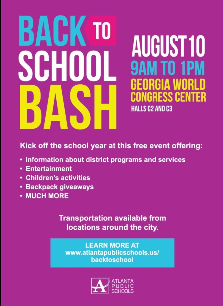 Atlanta Public Schools Back to School Bash Posted on August 7, 2019 by NPU-W Check out this flyer for info on this annual event. Share this: Click to share on X (Opens in new window) X Click to share on Facebook (Opens in new window) Facebook Like Loading...