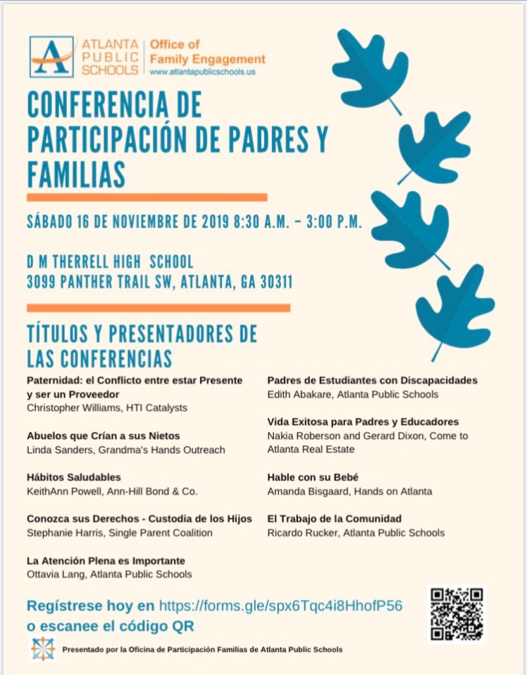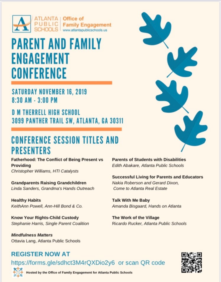The Office of Family Engagement is proud to present our 1 Parent and Family Engagement Conference on Saturday, November 16, 2019 from 8:30 am- 3:00 pm at D M Therrell High School. We are very excited about this event as our presenters have resources to share that address single parenting, fatherhood, kinship care (specifically grandparents), social emotionallearning, home ownership, students with disabilities, collaboration with school officers and families as well as a farmer who will speak on healthy habits! We look forward to seeing you!