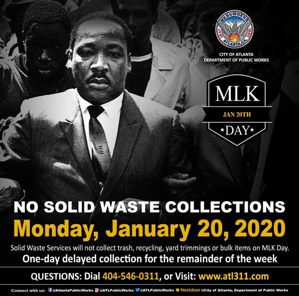 DPW Office of Solid Waste Services – Martin Luther King, Jr. Holiday Collection Schedule Posted on January 14, 2020 by NPU-W Share this: Click to share on X (Opens in new window) X Click to share on Facebook (Opens in new window) Facebook Like Loading...