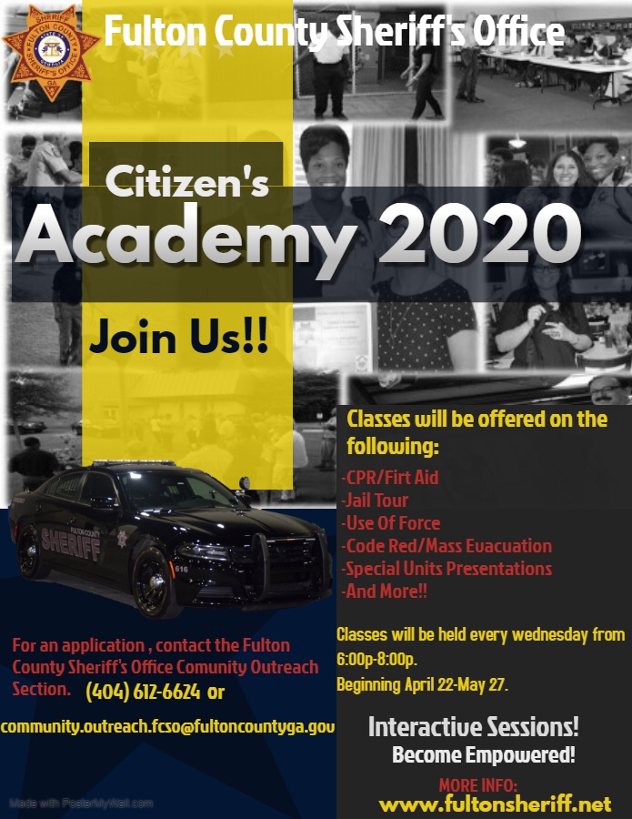 The program’s goal is to familiarize the community with the day to day operations of law enforcement. Participants will be given an inside look at the Fulton County courthouse and jail operations, as well as an overview of the basic responsibilities of law enforcement.