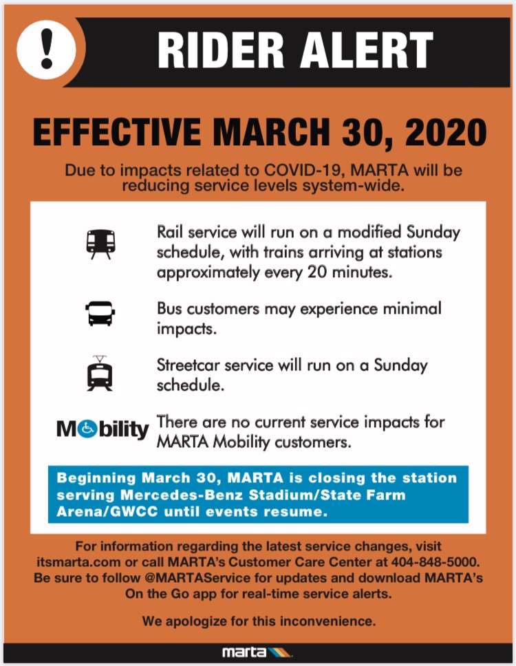 ATLANTA – The Metropolitan Atlanta Rapid Transit Authority (MARTA) is making operational adjustments beginning Thursday, March 26, to protect the health and wellness of employees as they continue providing essential transit service during the COVID-19 pandemic. Additionally, MARTA is making service plan changes to bus and rail operations beginning Monday, March 30, to address the dramatic ridership and revenue decline seen in the wake of this national health crisis.