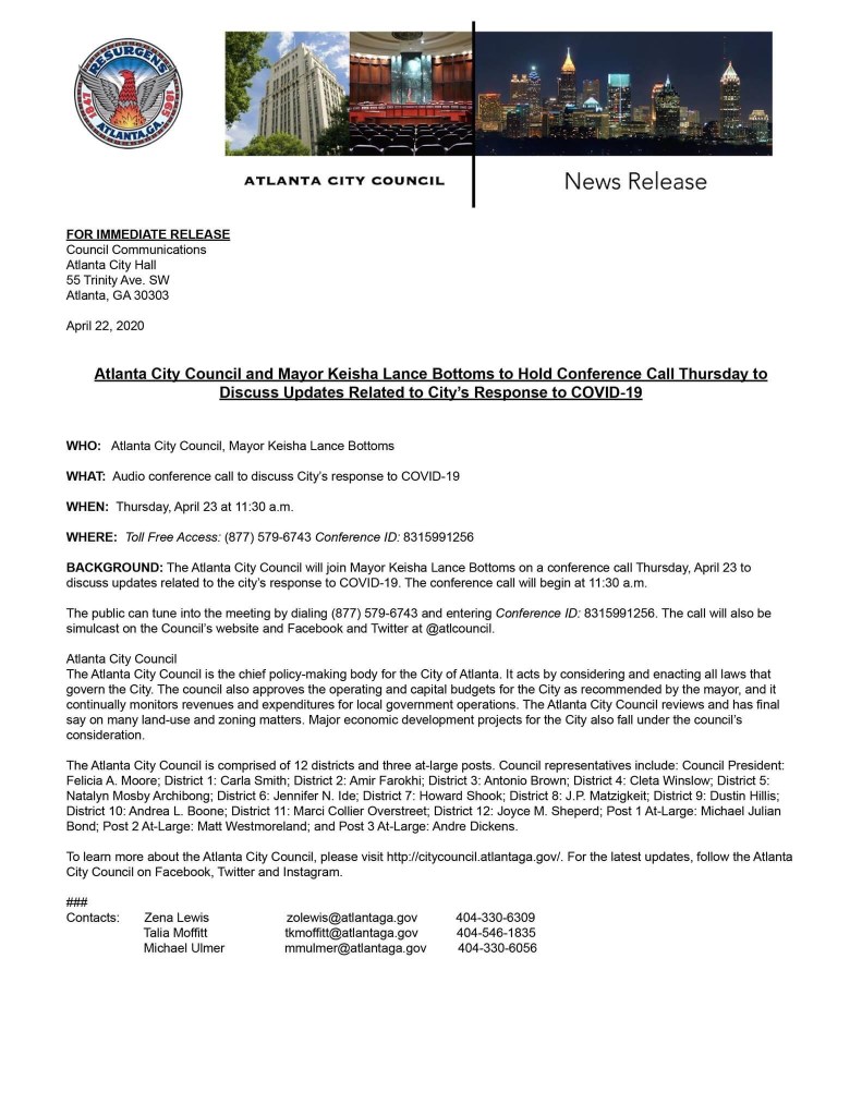 City Council and Mayor to Discuss COVID-19 Response Posted on April 23, 2020 by NPU-W As discussed by Councilmember Archibong on last night’s NPU-W online general meeting Share this: Click to share on X (Opens in new window) X Click to share on Facebook (Opens in new window) Facebook Like Loading...