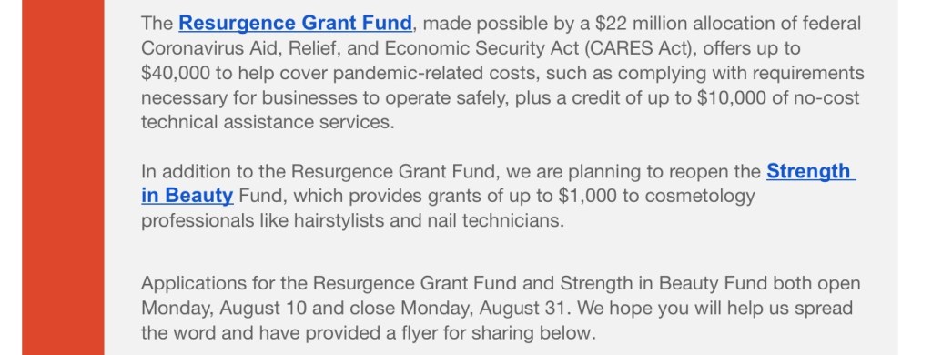 COVID-19 Small Business Grants Posted on August 4, 2020 by NPU-W Register for the August 4th Webinar HERE. Register for the August 12th Webinar HERE. Share this: Click to share on X (Opens in new window) X Click to share on Facebook (Opens in new window) Facebook Like Loading...