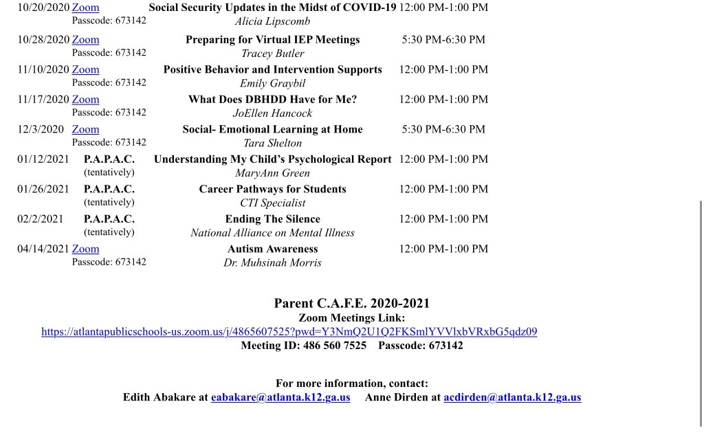 Atlanta Public Schools Parent C.A.F.E. 20/21 Flyer Posted on August 25, 2020 by NPU-W From APS and the Department of Special Education, please see these additional supportive opportunities. Share this: Click to share on X (Opens in new window) X Click to share on Facebook (Opens in new window) Facebook Like Loading...