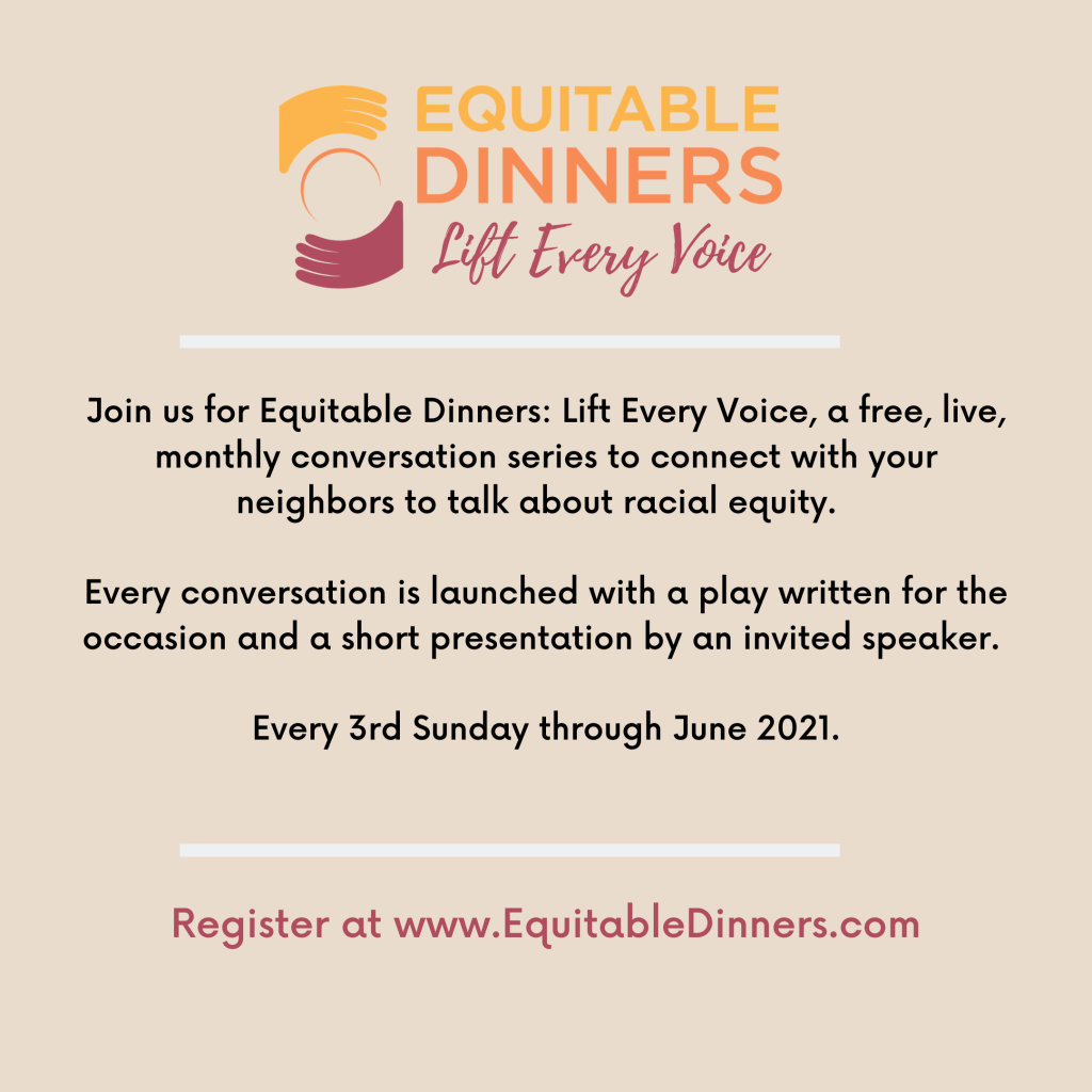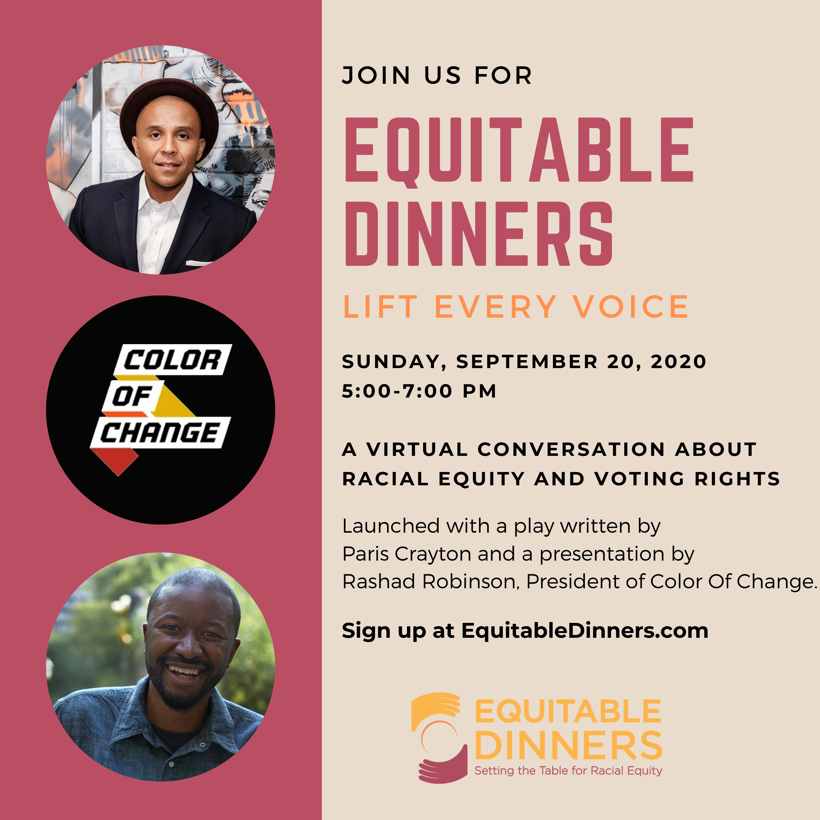 Join us for the next Equitable Dinners: Lift Every Voice on Sunday, September 20th. This Dinner will focus on racial equity and voting rights! The evening will start with a play by Paris Crayton followed by a presentation from Rashad Robinson, President of Color Of Change.