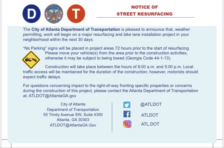 - Resurfacing of Cherokee Avenue SE from Memorial Drive SE to Mead Street SE
