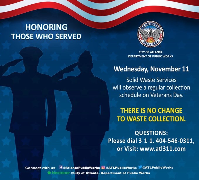 Solid Waste Services will observe a regular collection schedule on Veteran’s Day Posted on November 6, 2020 by NPU-W Share this: Click to share on X (Opens in new window) X Click to share on Facebook (Opens in new window) Facebook Like Loading...