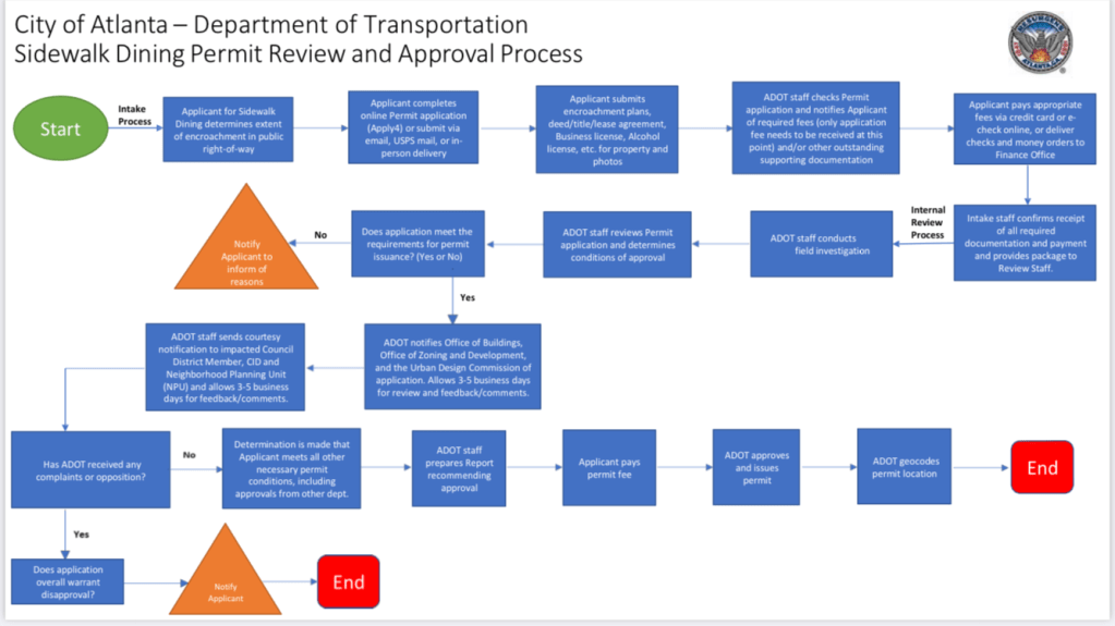 City of Atlanta Sidewalk (Right of Way) dining Posted on December 6, 2020 by NPU-W Please find the most recent City of Atlanta sidewalk dining application process. Click here to view the application. Share this: Click to share on X (Opens in new window) X Click to share on Facebook (Opens in new window) Facebook Like Loading...