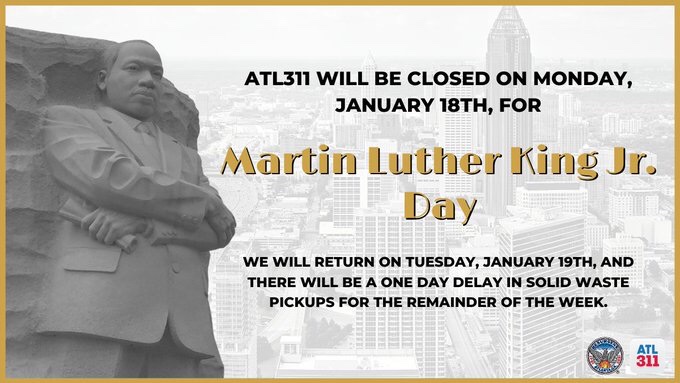 The Department of Public Works Office of Solid Waste Services will be closed in observance of the MLK Holiday on Monday, January 18. As a result, there will be a one-day delay in the collection of garbage, recycling, yard trimmings, and bulk collections for the remainder of the week. Collections normally picked up on Friday, January 22 will be collected Saturday, January 23. The regular collection schedule resumes Monday, January 25. Please call ATL311 at 404-546-0311, M-F during normal business hours, or visit www.atlantaga.gov/solidwaste for questions about your holiday collection schedule.
