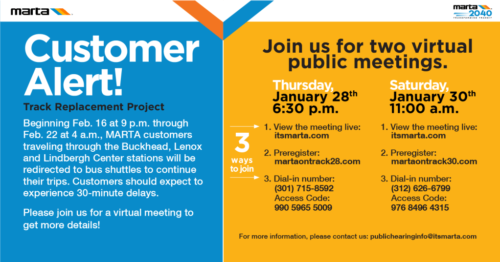 Join MARTA for two virtual public meetings 6:30 pm Thursday Jan 28 and 11:00 am Saturday Jan 30 to learn more about the track replacement project taking place February 16-22. Buses will replace trains between Lindbergh, Buckhead, & Lenox Stations. Details available at www.itsmarta.com/trackreplacement