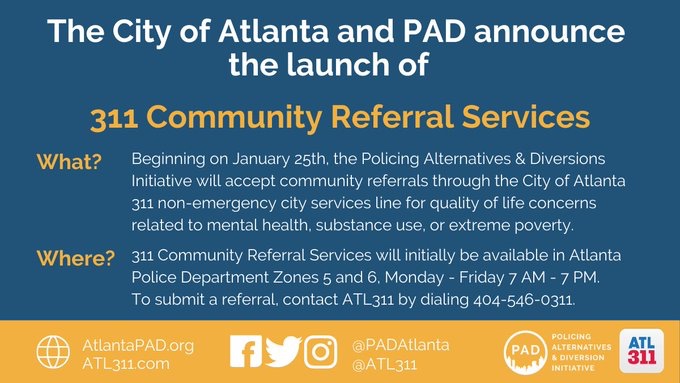 PAD 311 Community Referral Services is currently available in Atlanta Police Department Zones 5 and 6, Monday-Friday7am-7pm. Over the subsequent months, more APD zones will be added, with the goal of being citywide this summer. https://bit.ly/3ryv37k