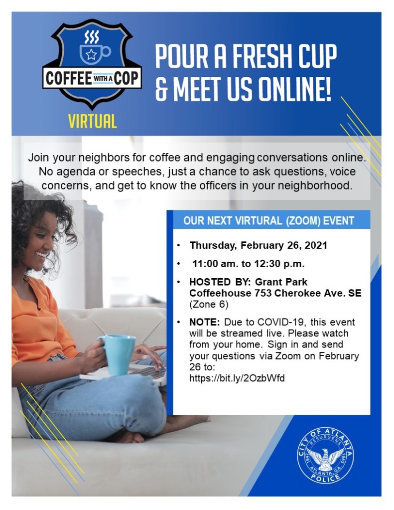 Join Atlanta Police Department’s Crime Prevention Unit and Command staff from Zone 6 for coffee and conversation on Thursday February 26, 2021 at 11:00am to 12:30pm via zoom(https://bit.ly/2OzbWfd).