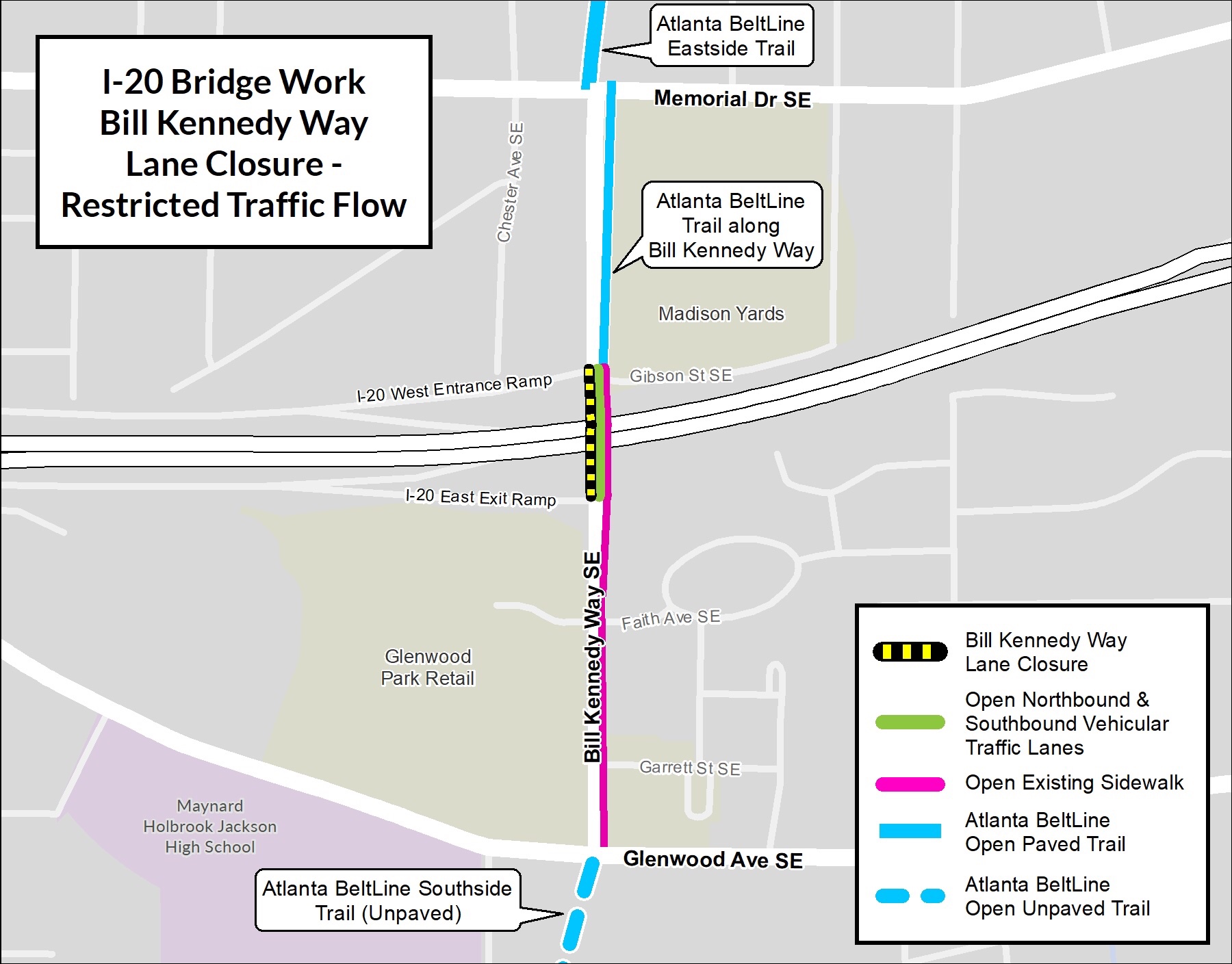 As we work to complete interim safety improvements to Bill Kennedy Way SE (BKW), Atlanta BeltLine, Inc (ABI) will begin work on the surface of the bridge over I-20. This work is intended to be completed in two phases. Phase 1 is expected to begin tomorrow, February 23rd and be completed April 2nd, but the schedule may be extended due to weather or other unforeseen delays. Phase 1 includes the addition of an 8’ trail on the eastside of the bridge that will be protected by a 2’8” concrete barrier wall that will connect the north and south trail segments.