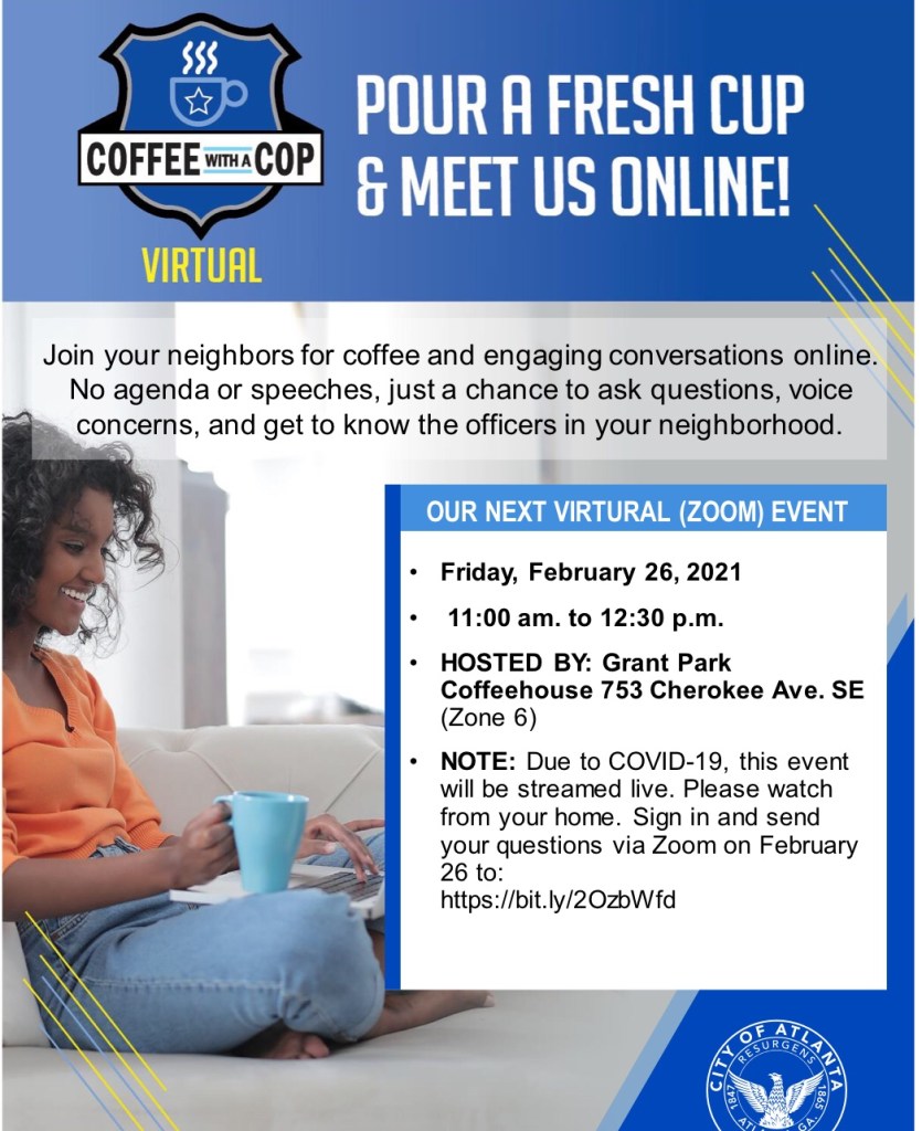 Please see the attached flyer for the upcoming Coffee With A Cop on Friday February 26, 2021 at 11:00am to 12:30pm via zoom. Please share this event along with RSVP form (https://forms.gle/s3dLg4jy4EmcZYco8 ). All attendee(s) must register.