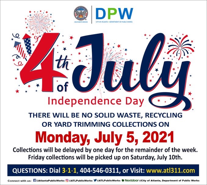 Independence Day holiday solid waste collection schedule changes Posted on July 2, 2021 by NPU-W Share this: Click to share on X (Opens in new window) X Click to share on Facebook (Opens in new window) Facebook Like Loading...