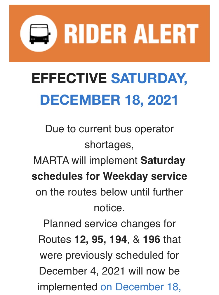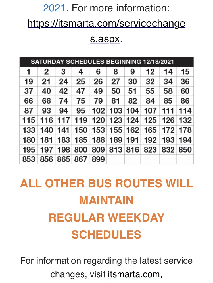 MARTA Bus Service Changes Beginning December 18th Posted on December 10, 2021 by NPU-W Share this: Click to share on X (Opens in new window) X Click to share on Facebook (Opens in new window) Facebook Like Loading...