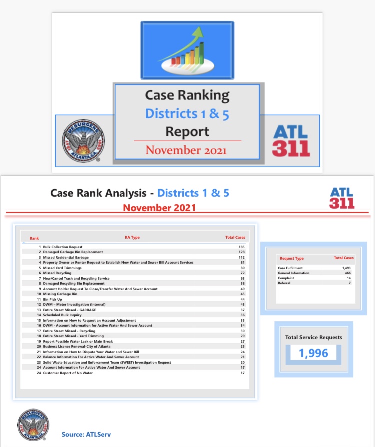 ATL311: Districts # 1 & 5 Top Ranking KA Report – November 2021 Posted on December 14, 2021 by NPU-W Share this: Click to share on X (Opens in new window) X Click to share on Facebook (Opens in new window) Facebook Like Loading...